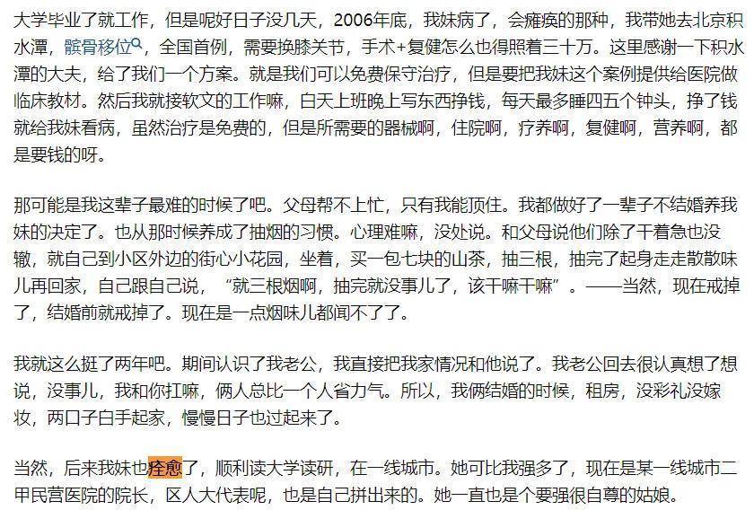 沉重的成年:工作伊始,妹妹突患重病面临瘫痪。她白天上班,晚上兼职,每天只睡五小时,独自扛起救治重任,甚至做好了终身不婚养妹妹的准备。